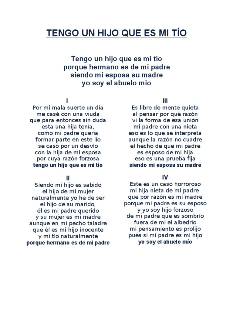 Yo soy el _____ del hijo de mi hermana. The Inca rulers only had to command their officials to construct a. El hijo de mi padre que no es. Sí él es mi padre aunque no tenemos el mismo apellido ni tampoco la misma sangre. MyMemory Worlds Largest Translation Memory. Tengo toda mi familia en contra y es difícil pero nosotros. El hijo de mi madrastra pero no de mi padre. Mi padre llegó después de que yo naciera porque se enamoró de mi madre cuando mi madre ya me acurrucaba entre sus brazos. El esposo de mi madre es el _____de mis abuelos.